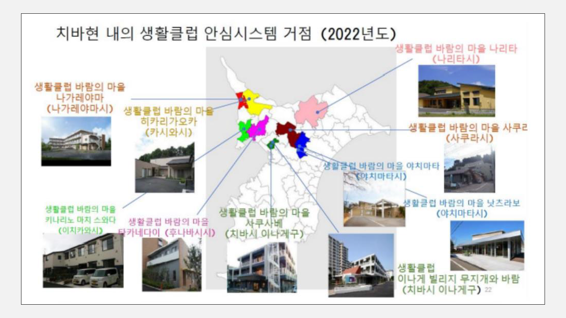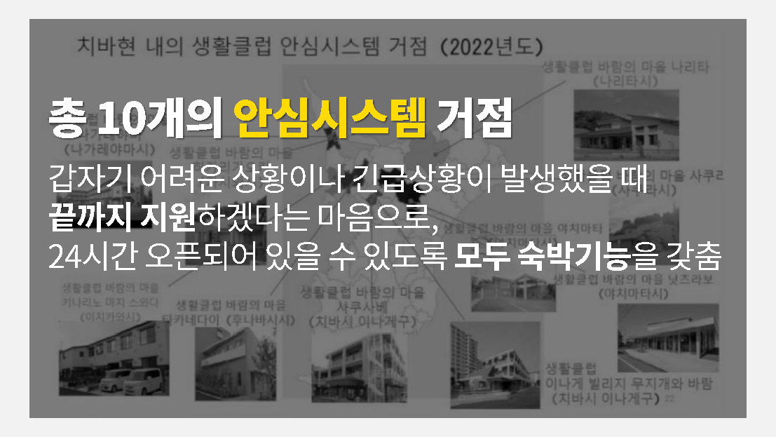 그렇게 치바현 내 10곳의 안심시스템 거점이 만들어지게 됩니다. 이 거점들은 갑자기 어려운 상황이 발생했을 때 끝까지 지원하겠다는 마음으로, 24시간 오픈되어 있을 수 있도록 모두 숙박기능을 갖추고 있다고 해요.