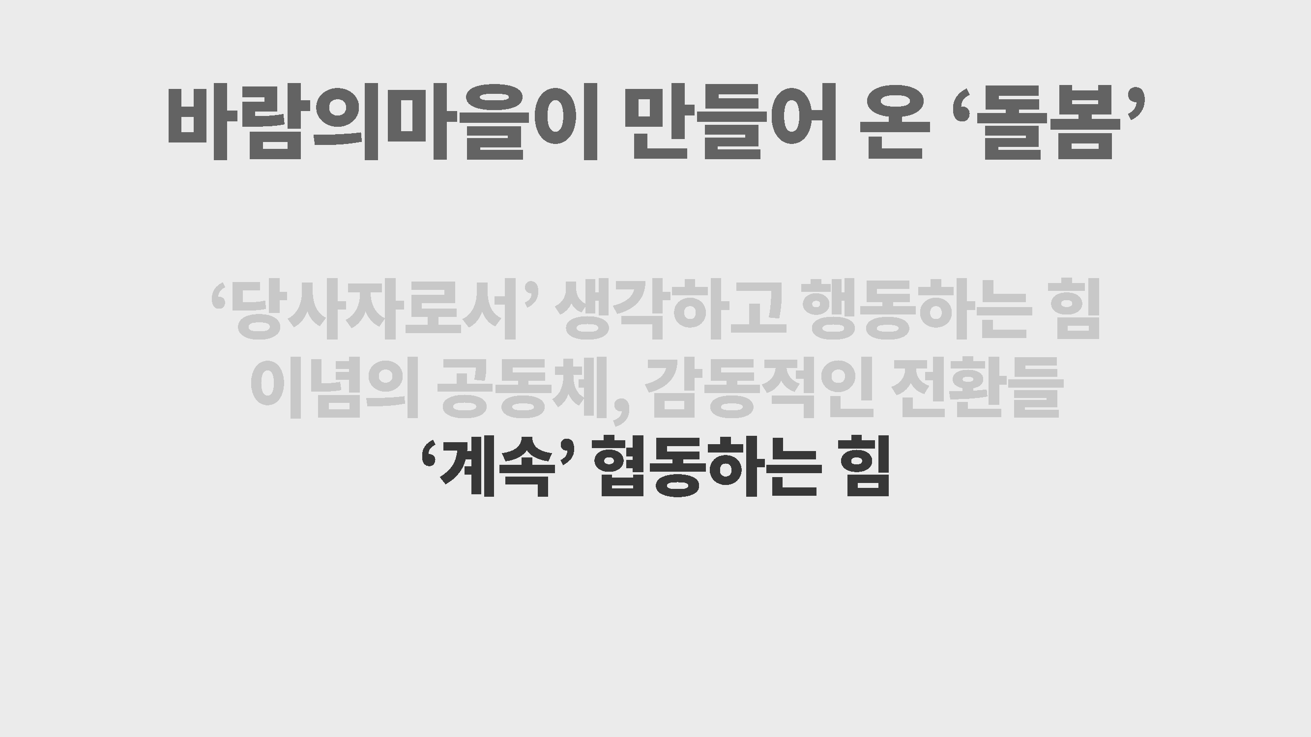 내가 가고 싶은 곳, 내가 받고 싶은 돌봄, 내가 당하고 싶지 않은 상황 같은 것은 누구도 당하지 않게 만들자라고 하는 그 당사자로서 생각하는 힘이 굉장히 중요한 힘이었다고 생각을 합니다.