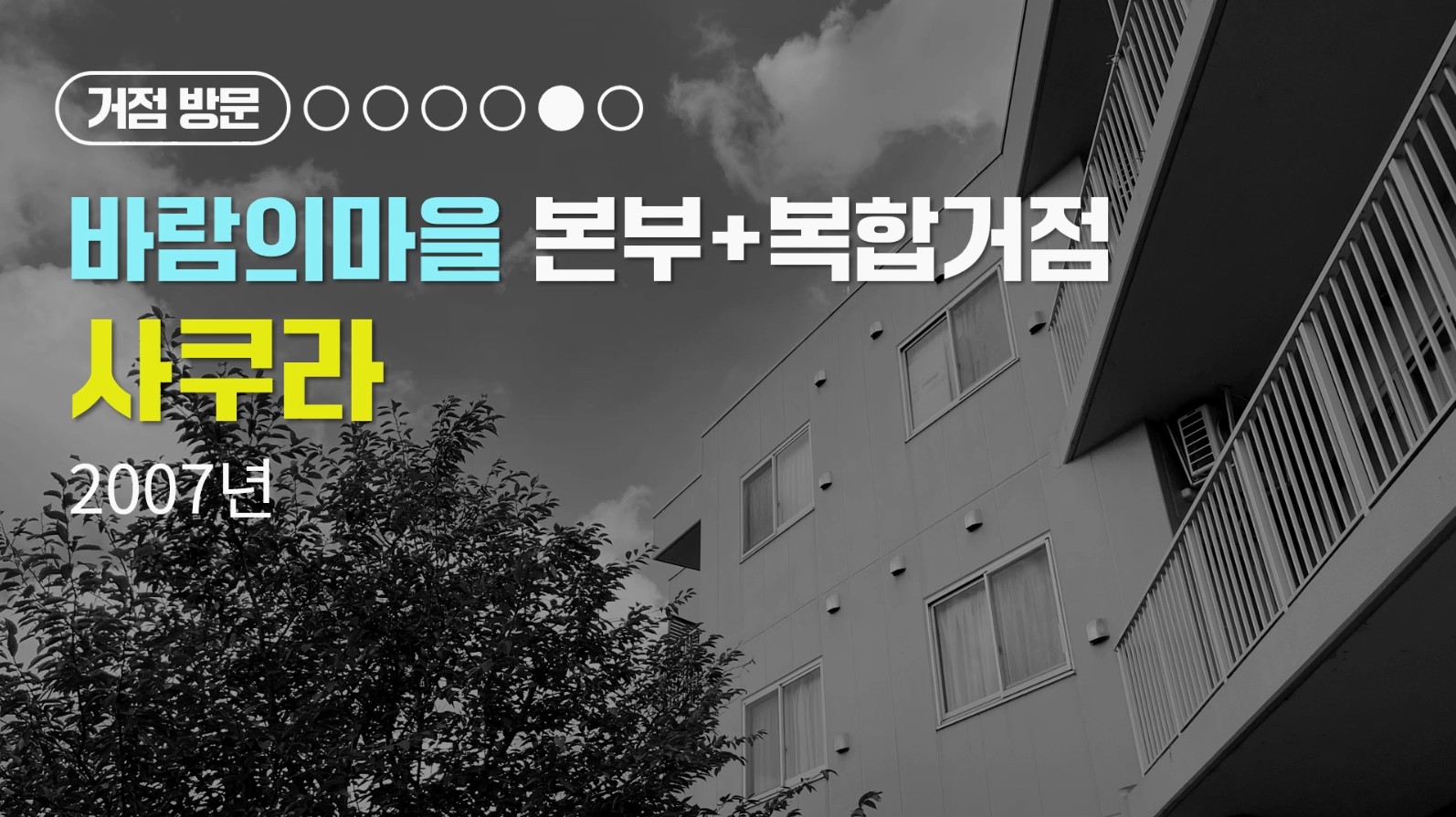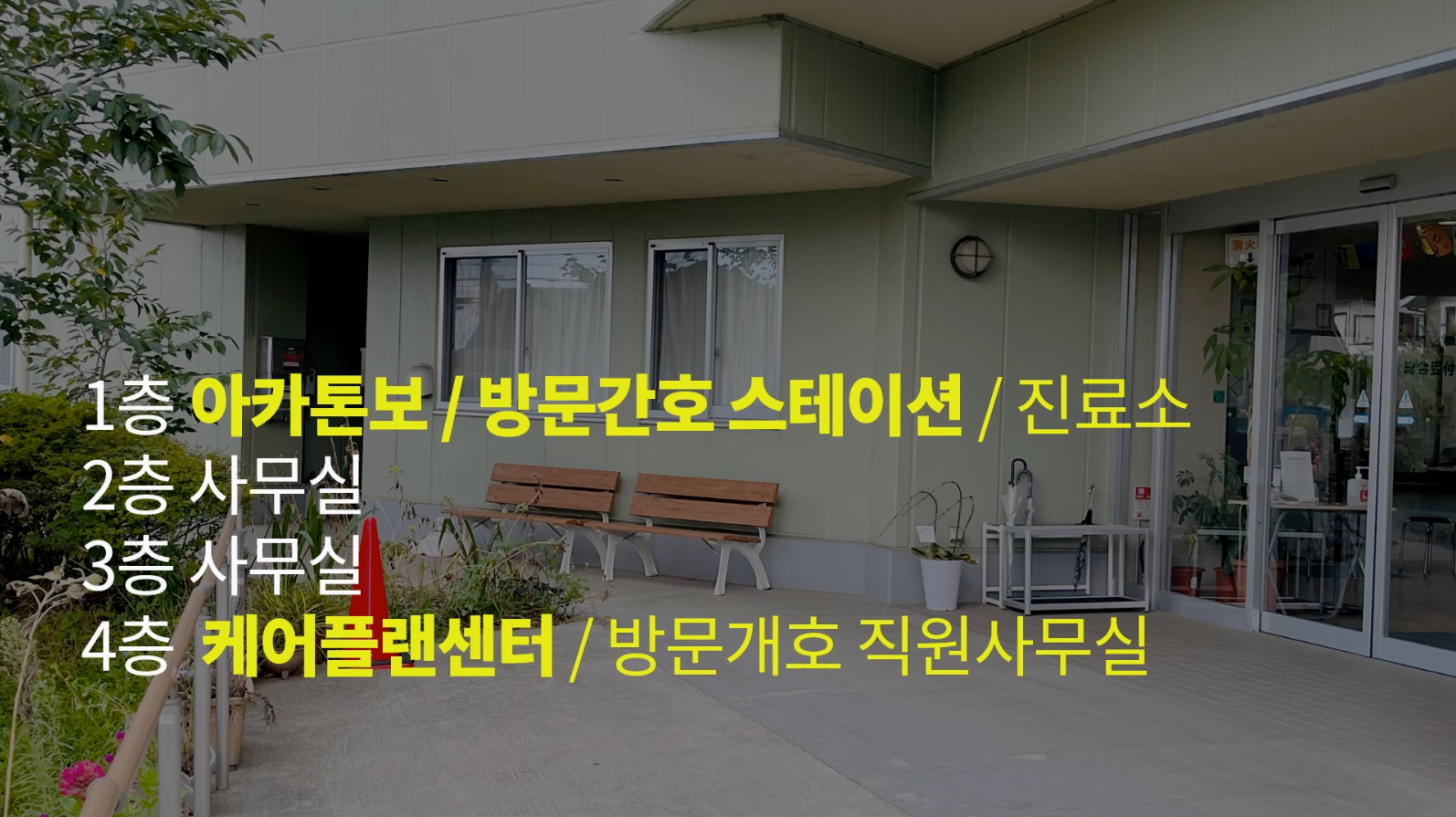 5번째 방문거점은 바람의마을 본부+복합거점인 사쿠라(2007년) 입니다. 외딴 길을 걸어 도착한 이 곳은 1층 아카톤보, 방문간호스테이션, 진료소 + 4층 케어플랜센터, 방문개호 직원 사무실로 이루어져 있었습니다.