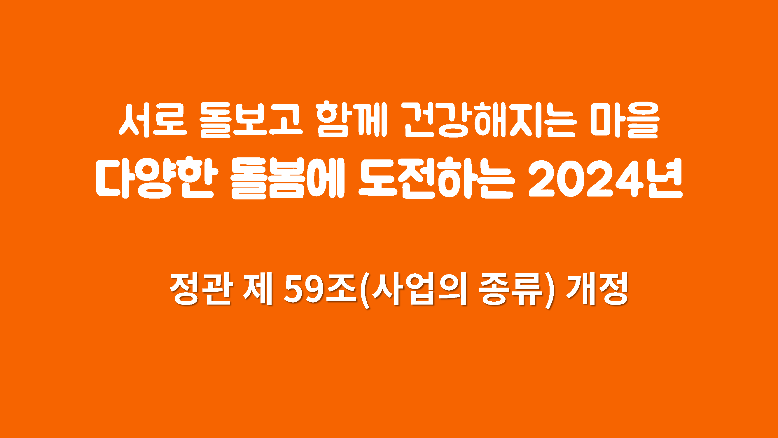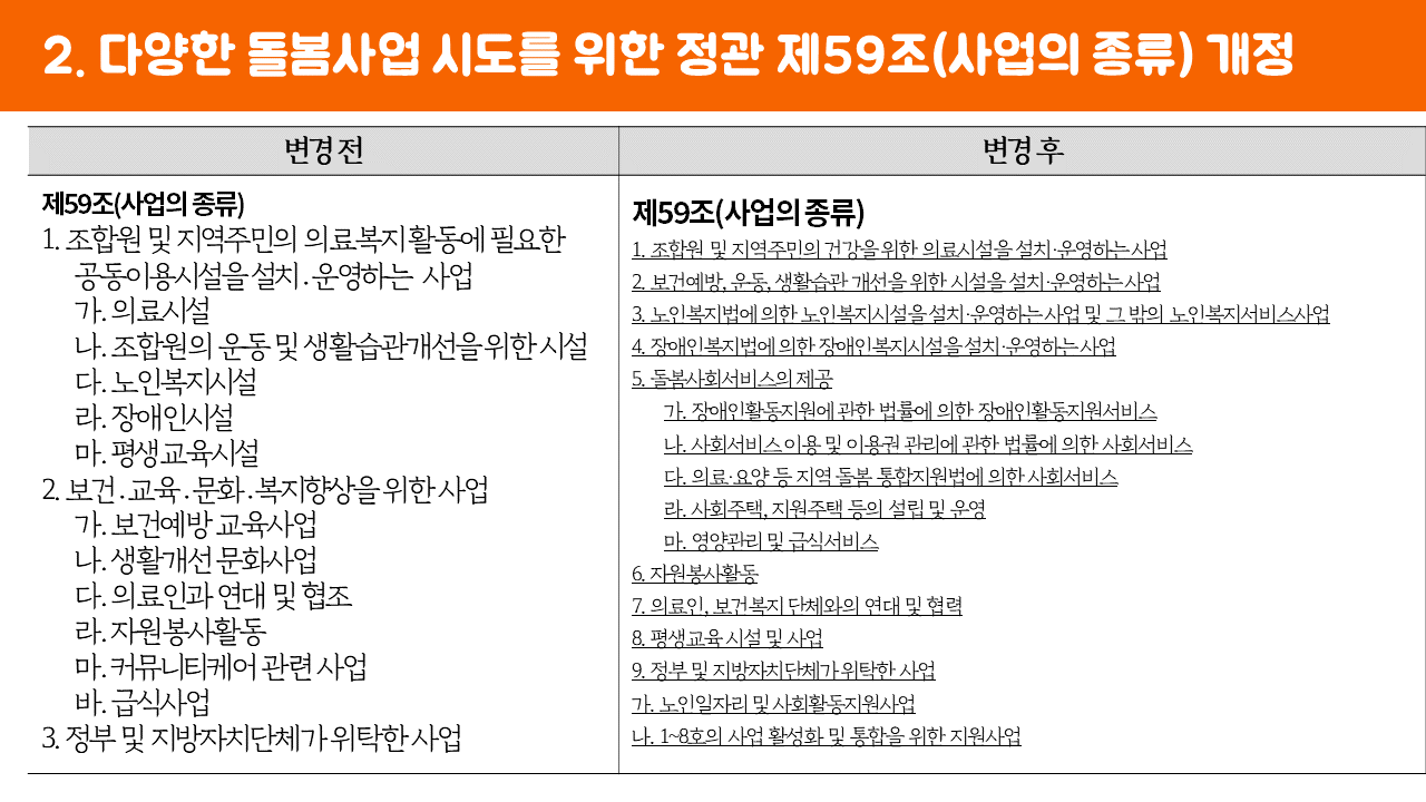 | 제59조(사업의 종류) 1. 조합원 및 지역주민의 의료복지 활동에 필요한 공동이용시설을 설치․운영하는 사업 가. 의료시설 나. 조합원의 운동 및 생활습관개선을 위한 시설 다. 노인복지시설 라. 장애인시설 마. 평생교육시설 2. 보건․교육․문화․복지향상을 위한 사업 가. 보건예방 교육사업 나. 생활개선 문화사업 다. 의료인과 연대 및 협조 라. 자원봉사활동 마. 커뮤니티케어 관련 사업 바. 급식사업 3. 정부 및 지방자치단체가 위탁한 사업 | 제59조(사업의 종류) 1. 조합원 및 지역주민의 건강을 위한 의료시설을 설치․운영하는 사업 2. 보건예방, 운동, 생활습관 개선을 위한 시설을 설치․운영하는 사업 3. 노인복지법에 의한 노인복지시설을 설치․운영하는 사업 및 그 밖의 노인복지서비스사업 4. 장애인복지법에 의한 장애인복지시설을 설치․운영하는 사업 5. 돌봄사회서비스의 제공 가. 장애인활동지원에 관한 법률에 의한 장애인활동지원서비스 나. 사회서비스 이용 및 이용권 관리에 관한 법률에 의한 사회서비스 다. 의료·요양 등 지역 돌봄 통합지원법에 의한 사회서비스 라. 사회주택, 지원주택 등의 설립 및 운영 마. 영양관리 및 급식서비스 6. 자원봉사활동 7. 의료인, 보건복지 단체와의 연대 및 협력 8. 평생교육 시설 및 사업 9. 정부 및 지방자치단체가 위탁한 사업 가. 노인일자리 및 사회활동지원사업 나. 1~8호의 사업 활성화 및 통합을 위한 지원사업 |