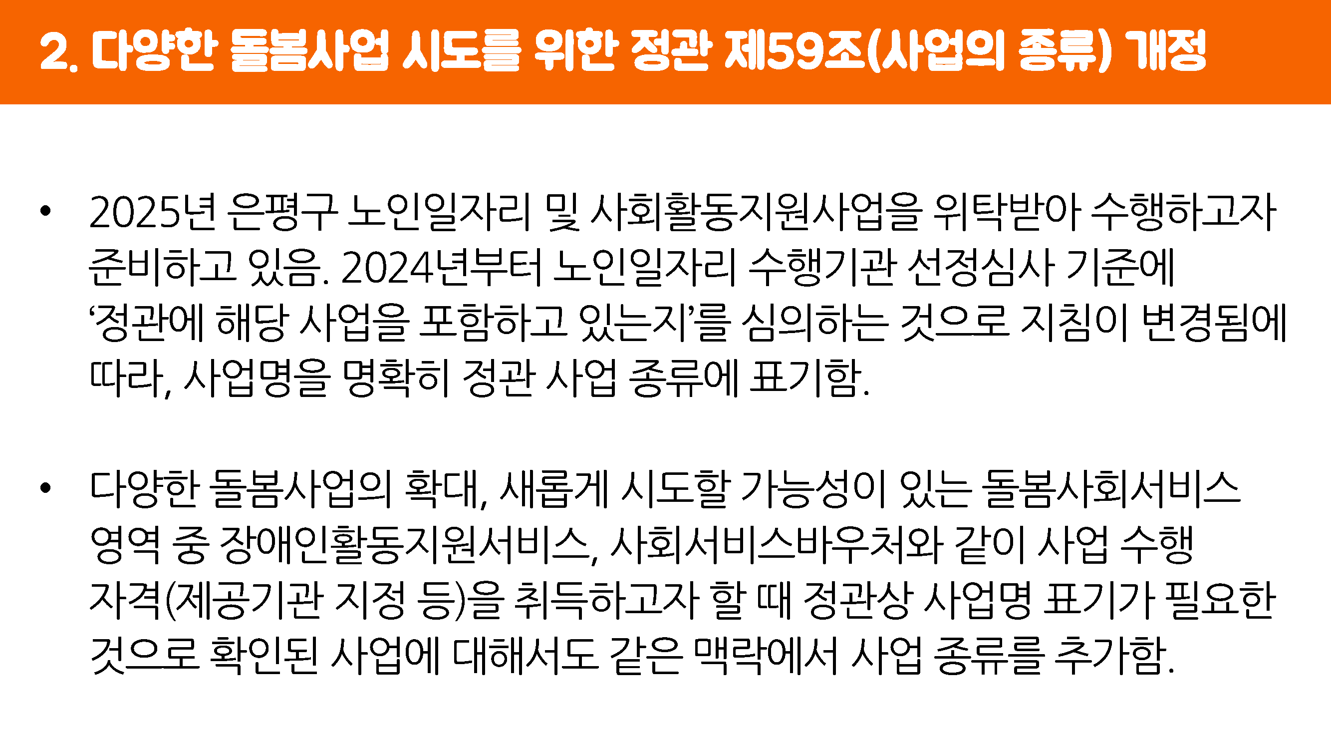 이 심의에 들어가기 위해서, 그 수행기관이 되고 싶은 조직은 정관의 사업내용 부분에 명확하게 '노인 일자리' 사업에 대한 내용이 포함되어 있어야 해요. 그래서 이렇게 정관개정을 위한 임시대의원 총회를 진행하게 되었는데요.