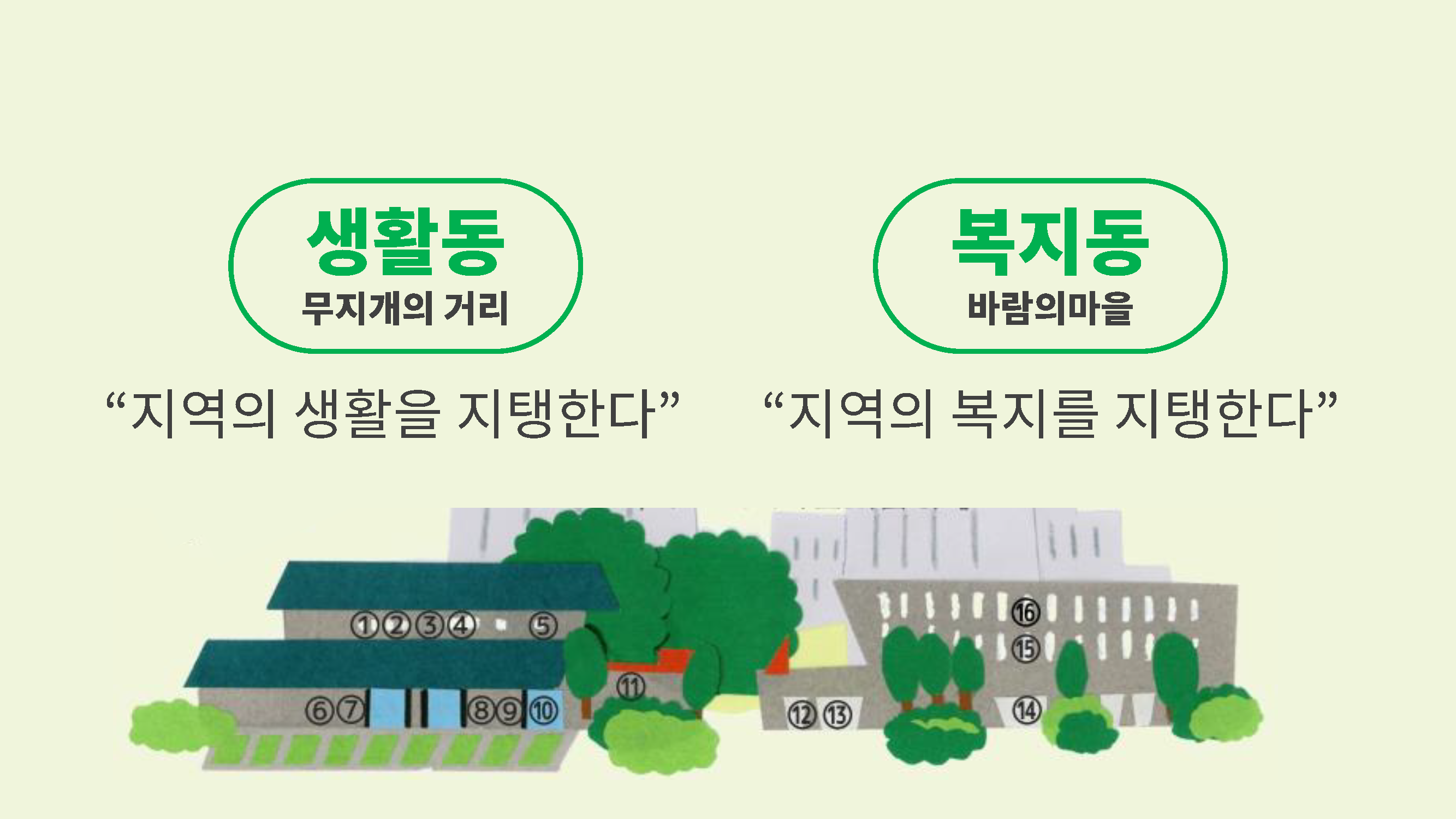이나게 빌리지는 앞서 이야기한 것 처럼 생활과 돌봄의 지역복합거점으로, 지역주민들에게 무엇이 필요한지 조사 후 만들었다고 해요. 이 곳은 생활동+복지동, 총 2개의 동으로 이루어져있는데요!