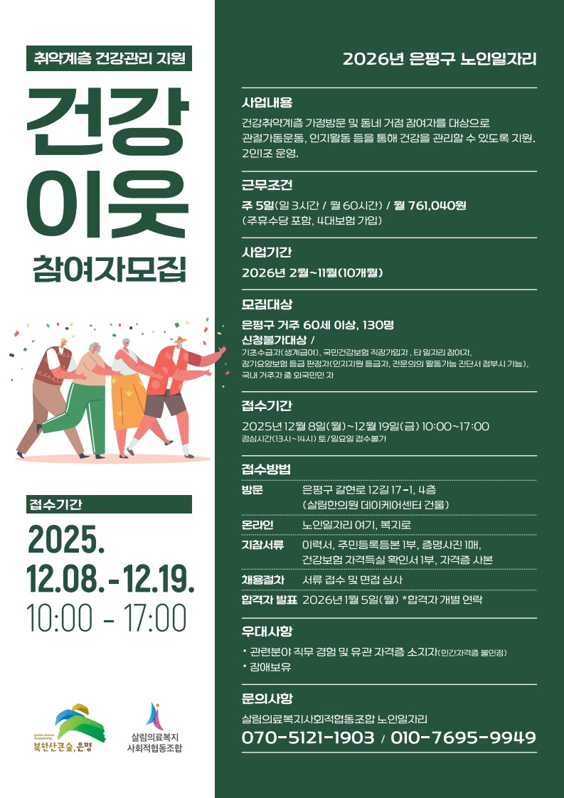 작성자살림의료복지사협작성시간25.11.27조회수486 목록 댓글 0살림과 함께하는, 2026년 은평구 노인일자리!