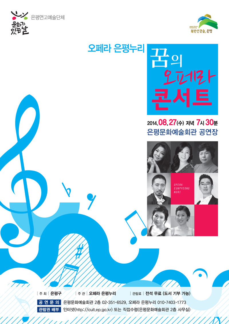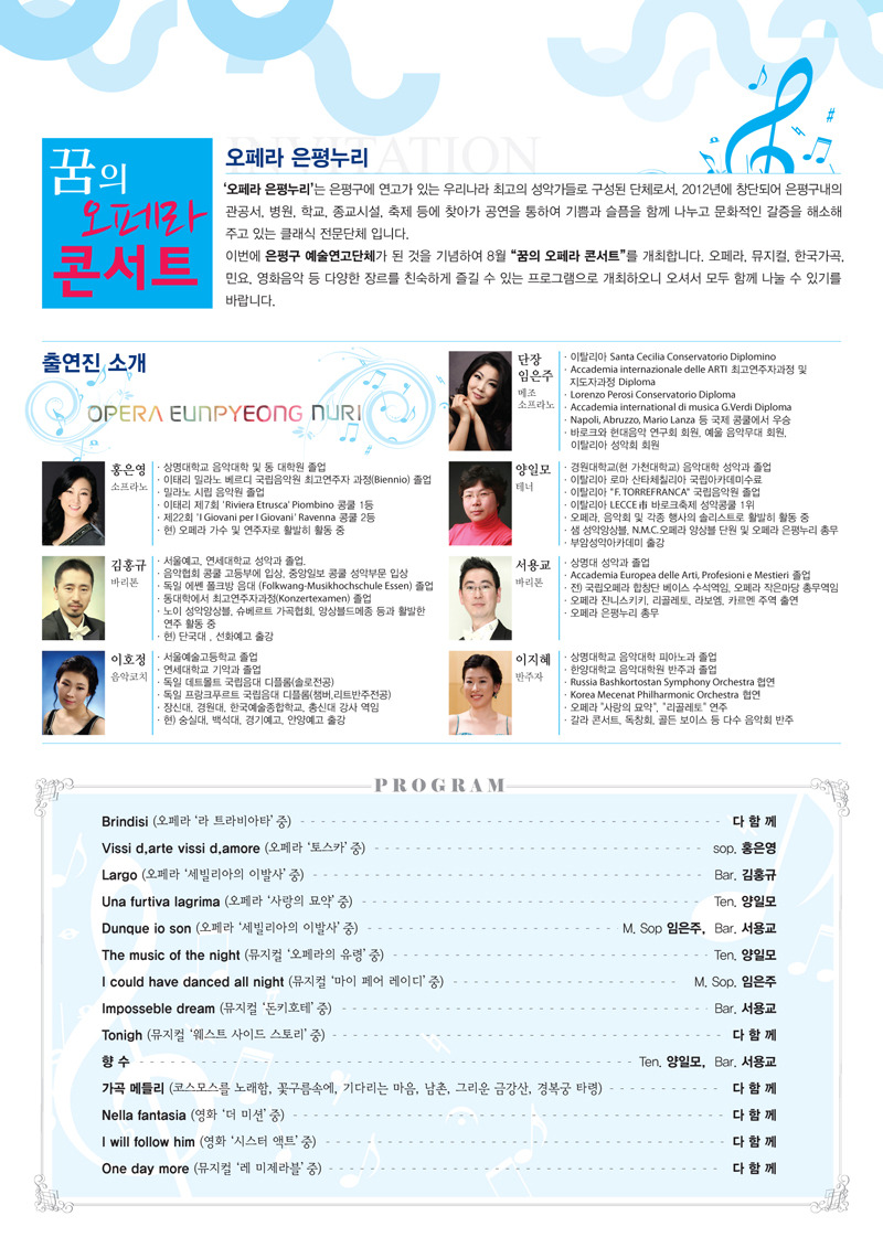 2012년 창단된 '오페라 은평누리'는 올해 은평구 예술연고단체가 된 것을 기념하여 은평구민에게 보다 근접한 자리에서 만나고 싶어서 2014년 8월 27일 수요일 저녁 7시30분에 은평문화예술회관에서 "꿈의 오페라 콘서트"를 마련하였습니다.