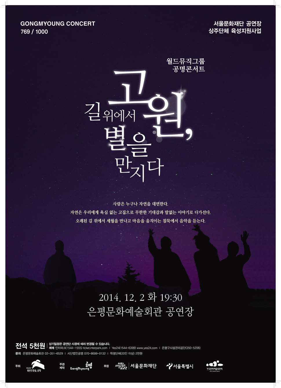 서울문화재단 공연장 상주단체 육성지원사업 은평구 상주단체인 공명의 "고원, 길 위에서 별을 만지다"정기공연이 2014.12/2(화) 저녁7시30분 은평문화예술회관 대극장에서 열린다. 이번 공연의 특징은"사람과 자연의 만남, 대면관계", 이다. 4명의 인원으로 구성된 월드 국악퓨전밴드인 공명은 2007년도에 KBS국악대상 단체부문 대상을 수상한 단체이며 초, 중 음악교과서에 창작곡을 실리기도한 글로벌 연주밴드이다. 관람료는 5,000원이며 20명 이상이면 2,000원, 사전예매가능,