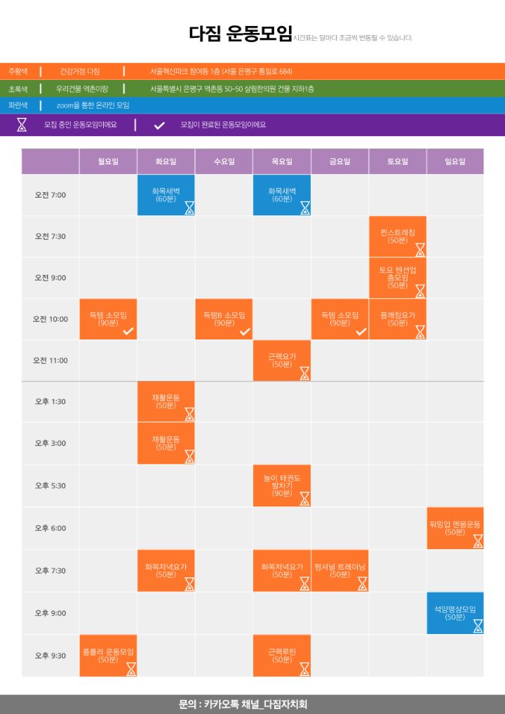 운동모임을 정리한 시간표입니다.