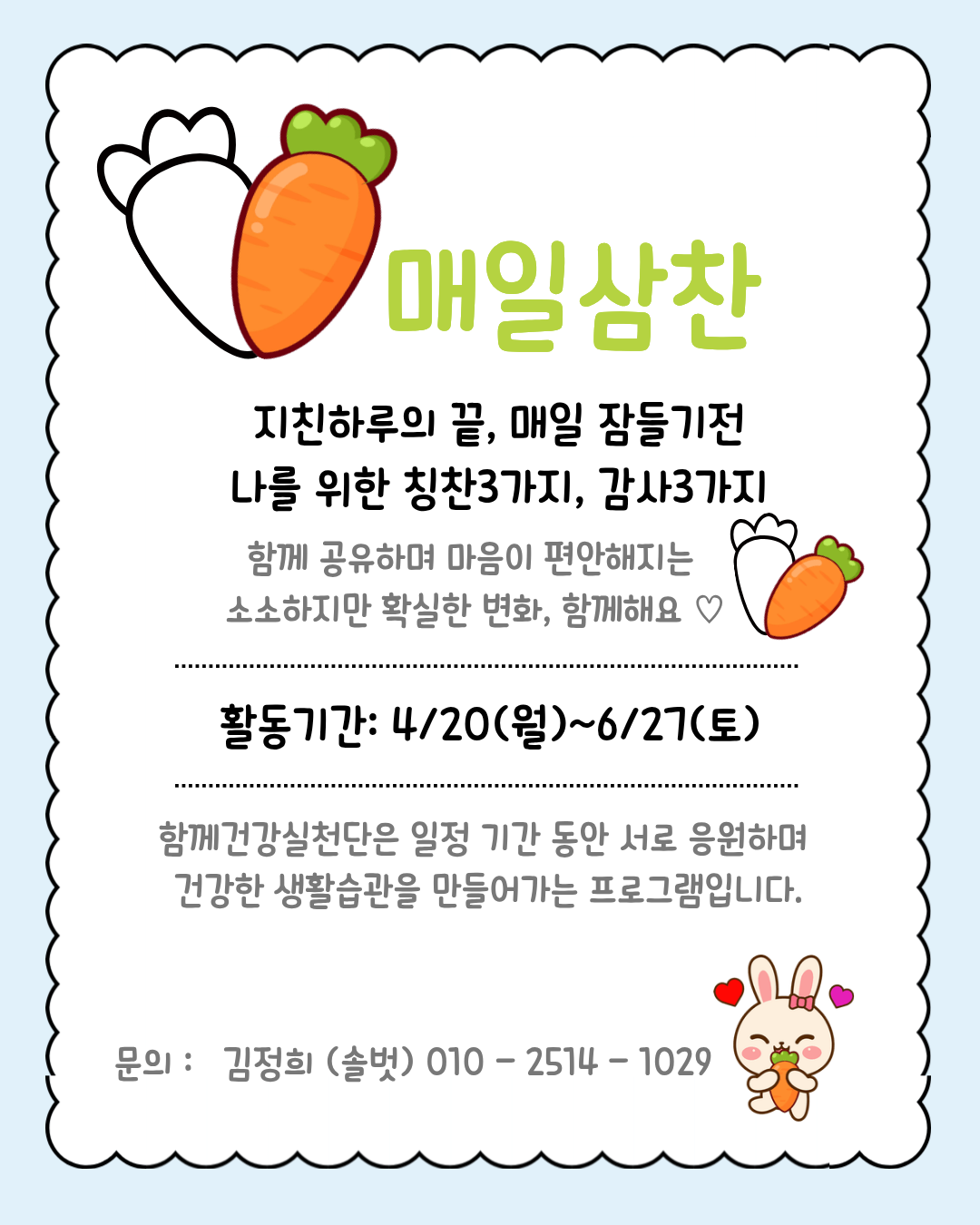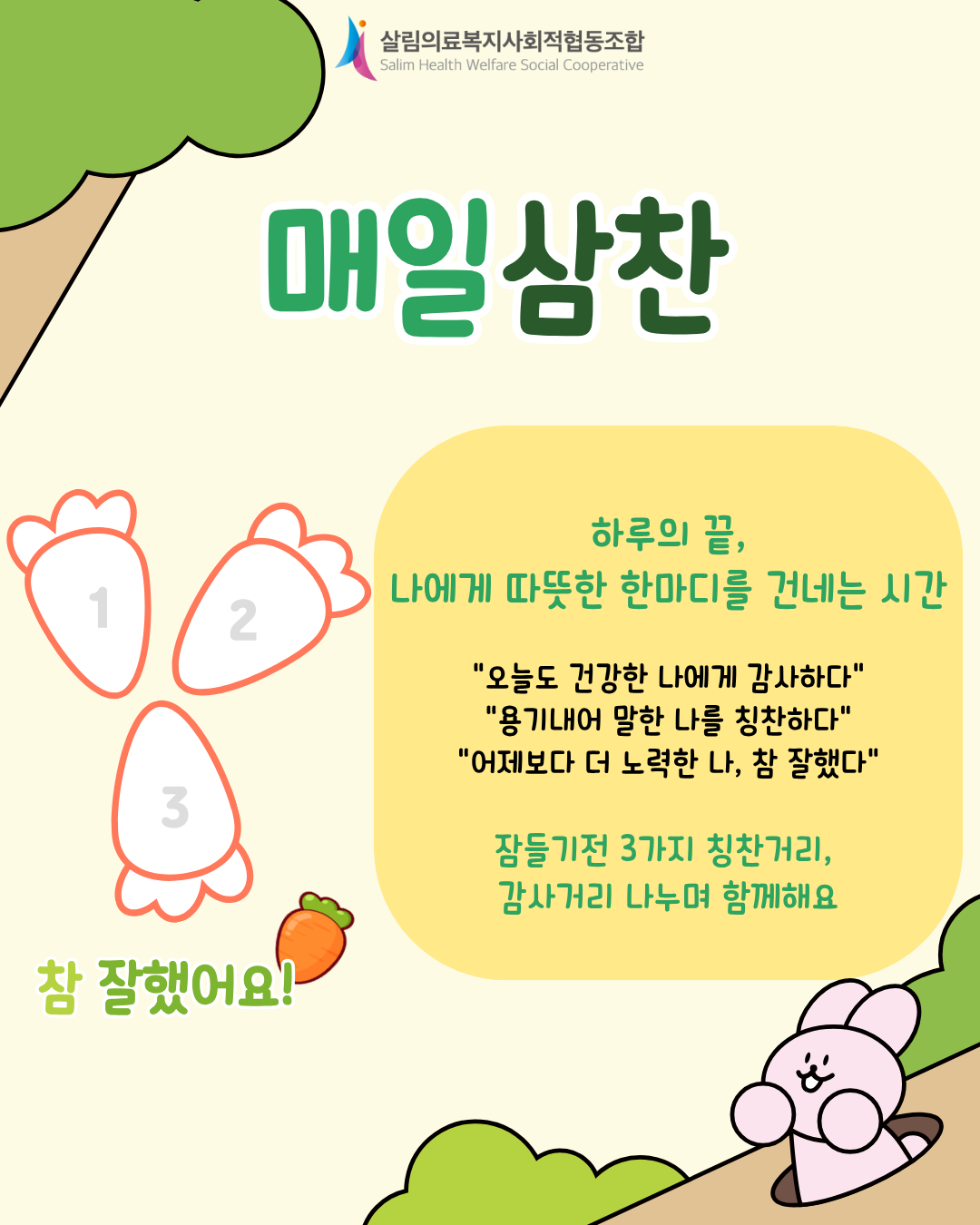 매일 밤 잠들기 전 자기 칭찬과 감사거리 3가지를 나누는 <매일삼찬>으로 초청합니다~^^ 작성자솔벗|작성시간26.04.10|조회수26 목록 댓글 0 글자크기 작게가 글자크기 크게가 다음검색 현재 게시글 추가 기능 열기 북마크 신고 센터로 신고 댓글 댓글 0 댓글쓰기 답글쓰기 댓글 리스트