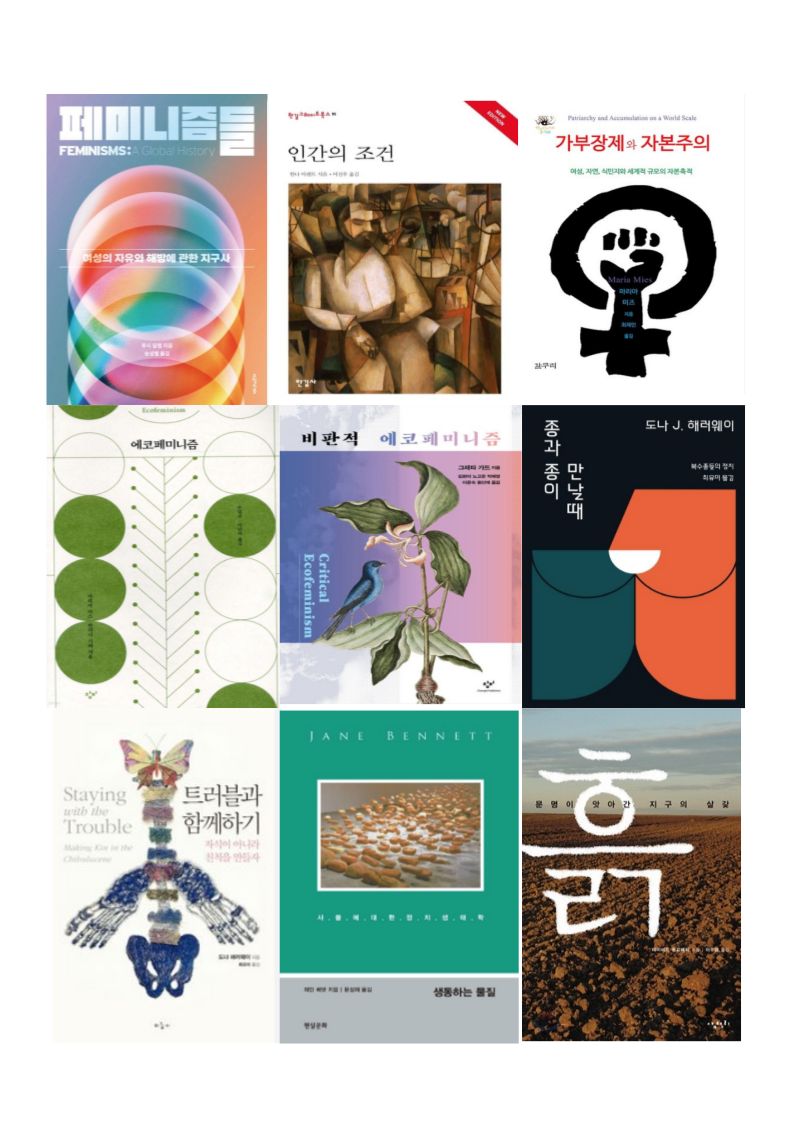 함께 읽을 책은 <페미니즘들> (루시 딜랩), <인간의 조건> (한나 아렌트), <가부장제와 자본주의> (마리아 미즈), <에코페미니즘>(마리아 미즈 & 반다나 시바), <비판적 에코페미니즘>(그레타 가드), <종과 종이 만날 때>(도나 해러웨이), <트러블과 함께 하기>(도나 해러웨이), <생동하는 물질>(제인 배넷), <흙> (데이비드 몽고메리)(총 9 권)입니다.
