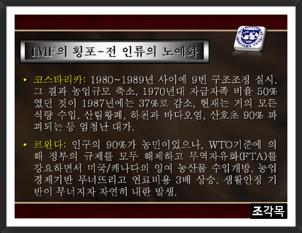 IMF는 도와주는 조건으로 한국과 전세계의 농업을 감소시켰다. 식량문제를 통해 무엇을 할려고 하는가?