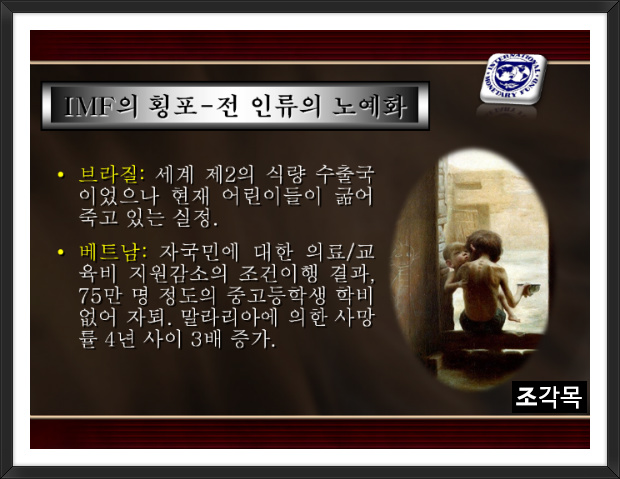 곡식을 생산해야 할 농토는 사라지고 농민들은 도시로 몰려 공장 노동자. 케냐, 가나, 르완다 등의 국가들은 IMF 덕분에 가난의 정도가 더 심해져 국민들은 아사할 지경이 되었고, 식량문제로 동족살상의 참극이 계속 일어나고 있는 것.