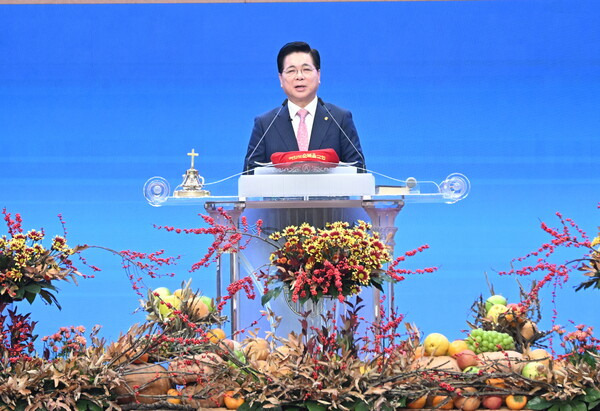 이영훈 목사는 “감사는 신앙의 기초이며, 기적을 여는 열쇠”라고 전하며, 어려움이 많은 시대일수록 신앙의 사람은 더 깊은 감사를 붙들어야 한다고 말했다. ⓒ여의도순복음교회