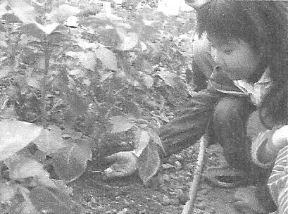 며느리가 반찬거리를 장만키 위해 텃밭에 따라나섰습니다.