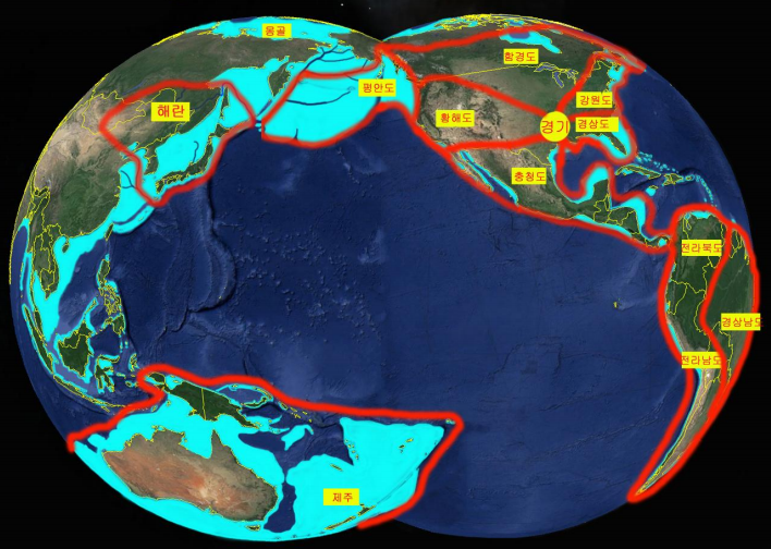한반도는 동서로 삼만리(약 12만km)에 탐라에서 총령까지 구만리(36만km) 였다고 하니 이 위치에 해당하는 대륙은 오세아니아와