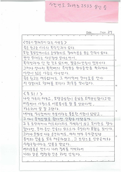 한강 토막 살인을 했다고 하는 장대호가 옥중에서 그 당시와 관련하여 편지를 썻다고 합니다