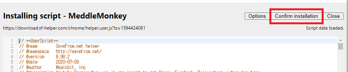 Confirm installation 버튼을 클릭하여 스크립트를 추가합니다.