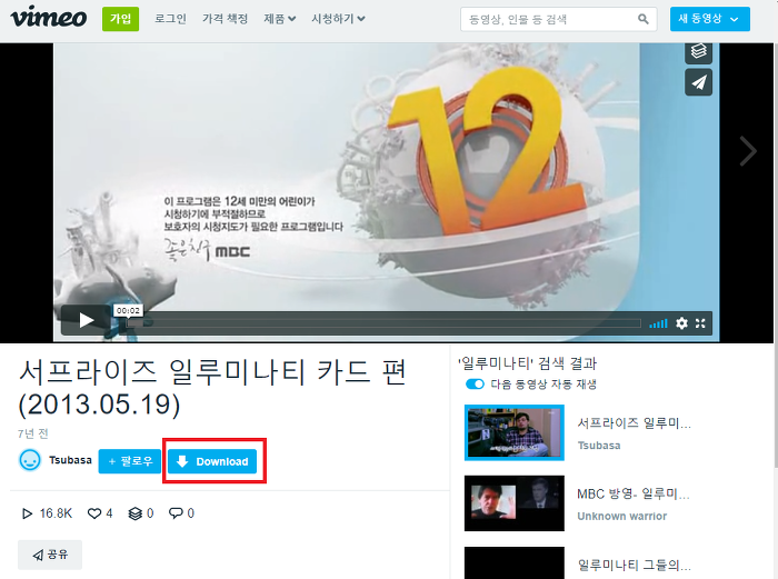 ■ 확장 프로그램 설치후 vimeo.com영상 다운로드 버튼 위치