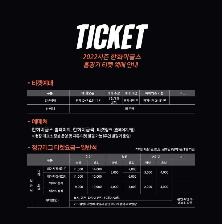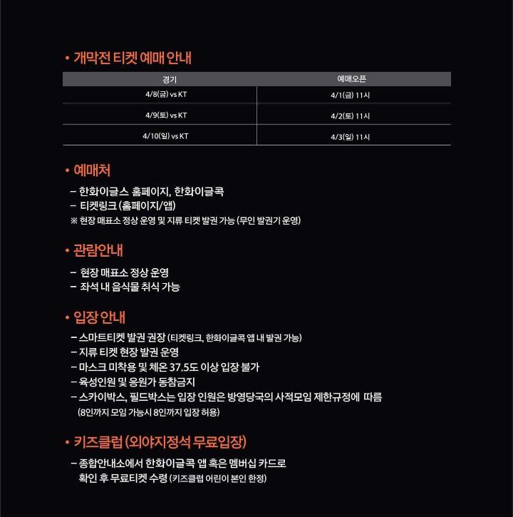 첫 경기인 홈개막전(4/8)의 예매는 4/1(금)에 오픈됩니다. 정말 그리웠던 관중 여러분들로 꽉찬 한화생명이글스파크의 모습을 기다립니다. 야구장에서 뵙겠습니다!