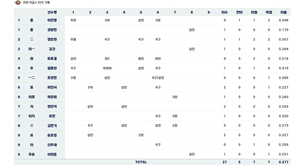 한화이글스2군 타자기록