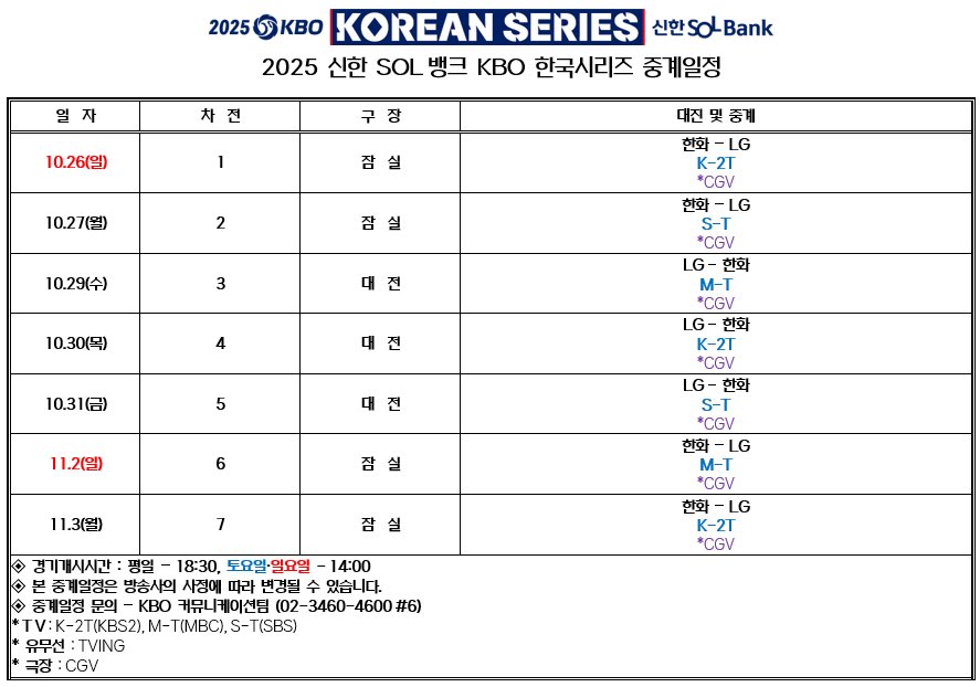 2025 KBO 한국시리즈 중계일정 작성자jinjin|작성시간25.10.25|조회수115 목록 댓글 0 글자크기 작게가 글자크기 크게가 다음검색 현재 게시글 추가 기능 열기 북마크 공유하기 신고 센터로 신고 댓글 댓글 0 댓글쓰기 답글쓰기 댓글 리스트
