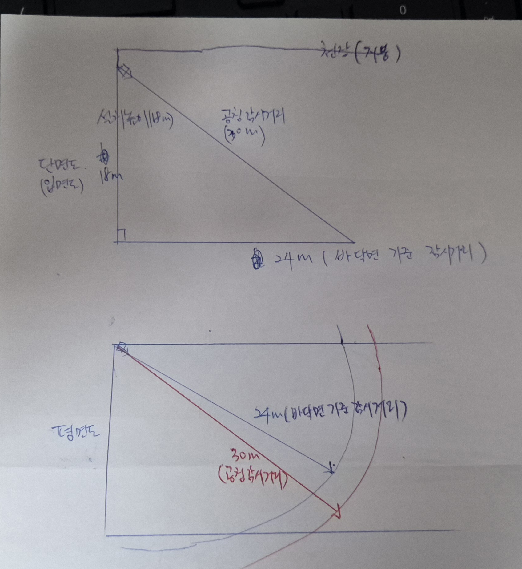 단면도에서는 30m로 반경을 그리고, 평면도에서는 설치높이에 따는 바닥면 감시거리를 계산(피타고라스의 정리 이용)한 값인 24m로 반경을 그리는 것이 맞다고 봅니다.
