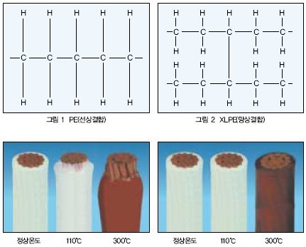 2) PE와 비교하여 내열성, 기계적 성능을 향상시켜 열변형특성, 열노화 특성이 우수하기 때문에 연속 최고허용온도를 90℃로 향상시킨 것으로 대용량의 초고압 송전용 케이블의 절연재료로 사용되고 있다.