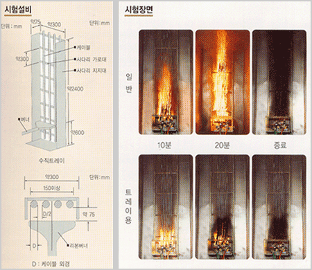 트레이용 난연케이블은 KS C 3341 또는 IEEE 383에 따른 수직 트레이 난연시험(VTFT) 특성을 만족합니다.