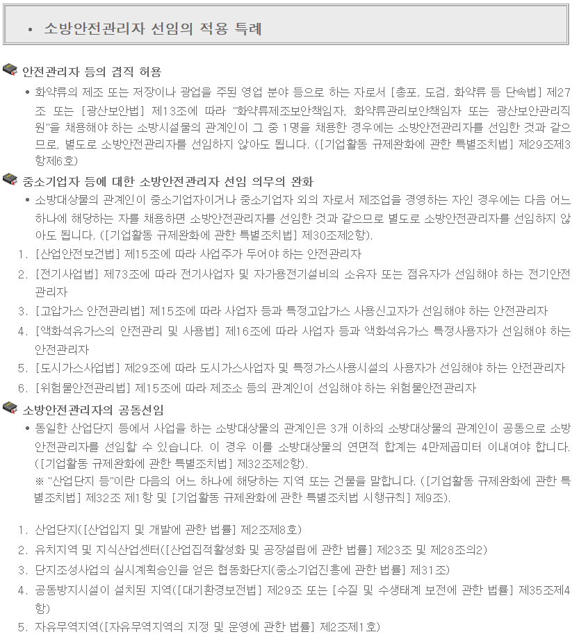 이 예외 조항때문에 대부분의 사람들이 소방안전관리자와 전기안전관리자가 동시 선임 가능하다고 알고 계시지만, 중소기업등 일부 예외조항외에는 원론적으로는 겸직이 안되는것이 맞습니다.