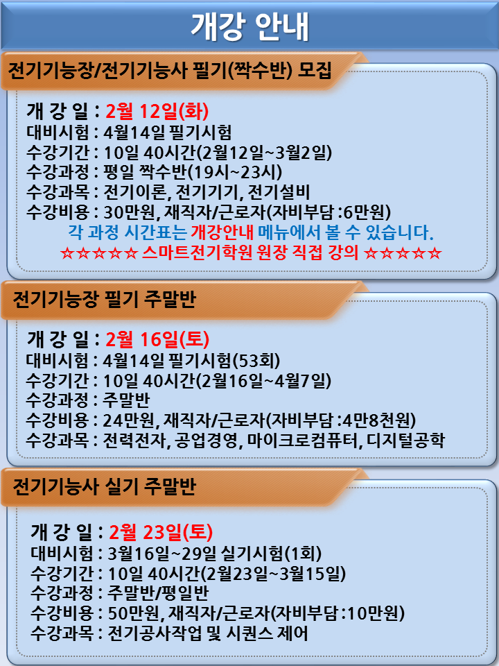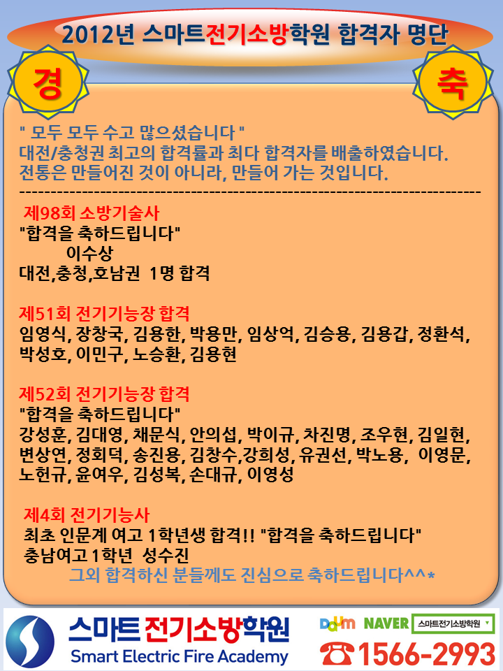 대전/충청권 최고의 시설과 강사진( 기술사가 제일 많은 학원 )이 있는 학원 - 스마트 전기소방학원 - 작성자스마트전기소방학원|작성시간13.02.10|조회수83 목록 댓글 0 글자크기 작게가 글자크기 크게가 다음검색 현재 게시글 추가 기능 열기 북마크 공유하기 신고 센터로 신고 댓글 댓글 0 댓글쓰기 답글쓰기 댓글 리스트