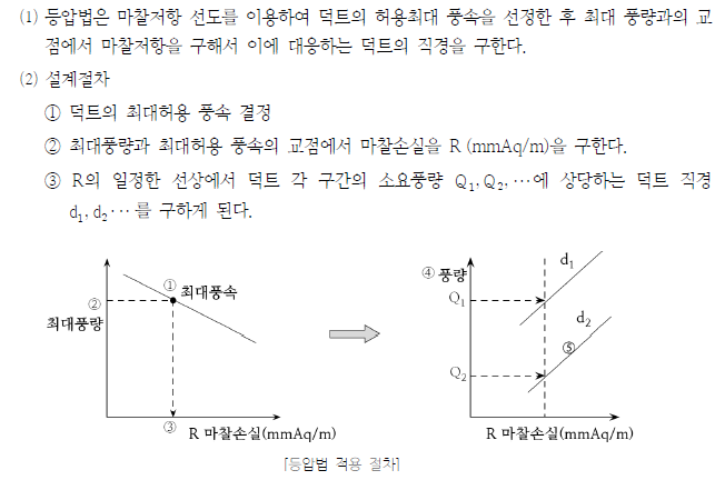 이는 등마찰법으로 덕트 저항손실(mmAq/m)을 일정하게 적용하고 덕트의 크기를 계산하는 방법으로 주덕트 및 분기덕트의 압력을 균일하게 적용한다.