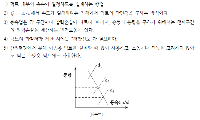 가) 등속법은 주관에서 지관에 이르기까지 덕트 내의 풍속을 모두 일정하게 하여 덕트 치수를 결정하는 방법이다.