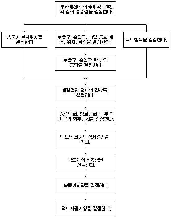 덕트는 공조대상 공간의 열부하를 구하여 그 열부하 처리에 필요한 풍량을 구하는 것을 출발점으로 한다. 이 소요 풍량에 의하여 실내의 공간분포가 좋아질 수 있도록 토출구, 흡입구의 개수 및 위치를 결정하고 이 토출구, 흡입구와 공기조화기를 연결하는 기술적, 경제적으로 가장 합리적인 덕트의 경로를 결정하여 도면에 그 개략도를 그린다.