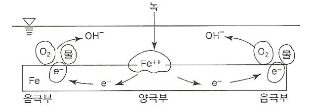 물속에 녹아 있는 산소는 금속에 대해 산화제로 작용하고 화학반응에 의해 수산화이온(CH-)을 생성하는데 이것이 철원자와 반응하여 녹의 원인이 되는 수산화제일철을 생성하므로 부식이 진행하게 된다.