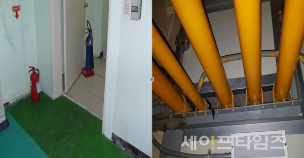 ▲ 한 건물 출입구가 개방(왼쪽 사진) 돼 있고 건물 천정에 가스방호구역을 관통하는