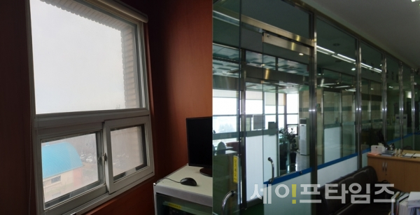 ▲ 한 건물 창문 개구부가 유리 재질(왼쪽 사진) 인데다, 유리재질의 출입구에는