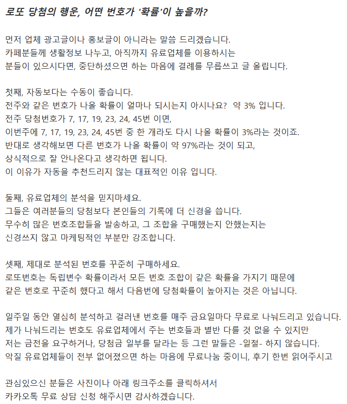 【공유】로.또 당첨의 행운. 어떤 번호가 '확률'이 높을까? 작성자대한노인복지센터|작성시간22.08.20|조회수59 목록 댓글 1 글자크기 작게가 글자크기 크게가 다음검색 현재 게시글 추가 기능 열기 북마크 공유하기 신고 센터로 신고 댓글 댓글 1 댓글쓰기 답글쓰기 댓글 리스트 작성자불멸의꽃 | 작성시간 22.09.15 댓글 전체보기