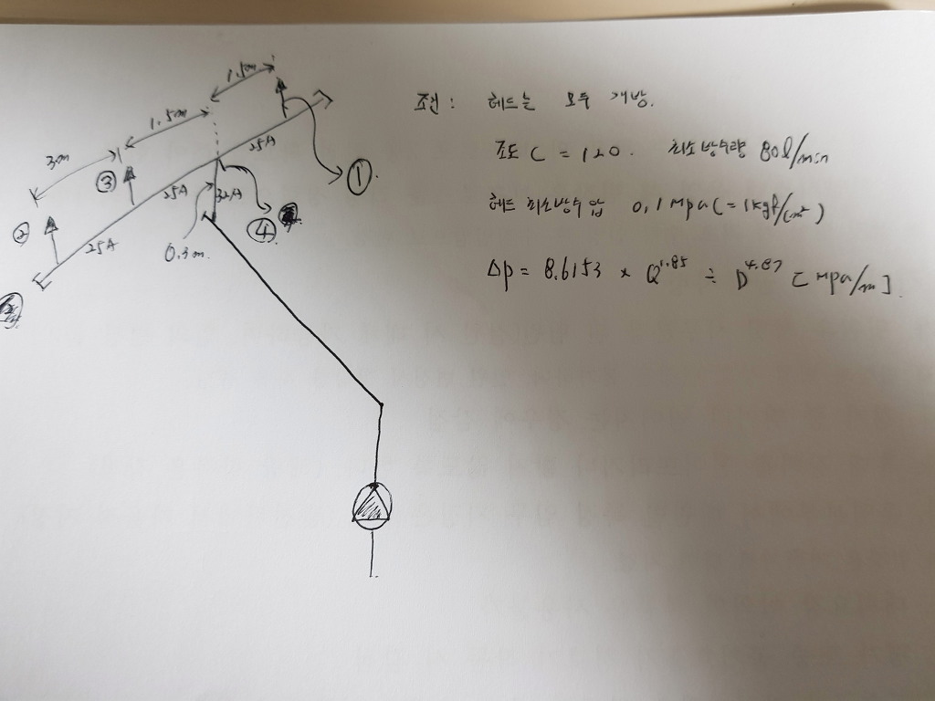 1. 상기 문제에서 2번헤드쪽으로의 유량이나 방수압 계산이 쉬운데