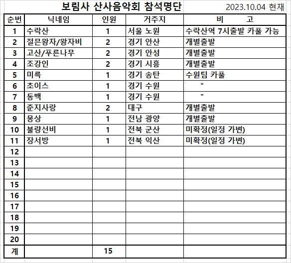 작성자수락산 작성자 본인 여부 작성자 작성시간 23.10.14 캐나다에 게신 겨울비님께서 우리 첫차 턱별 전용기편으로 오늘 함께 하십니다.