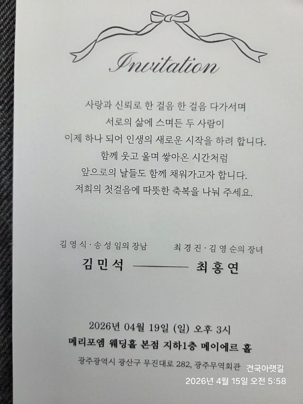 제딸 결혼식 초대합니다~^^ 작성자건국아랫길(최경진)|작성시간26.04.15|조회수205 목록 댓글 34 글자크기 작게가 글자크기 크게가 한분한분 찿아봬고 인사드지못해죄송합니다~~제딸 결혼식에 많은 회원님들 참석해주셔서 축복해주세요~~^^ 다음검색 현재 게시글 추가 기능 열기 북마크 공유하기 신고 센터로 신고 댓글 댓글 34 댓글쓰기 답글쓰기 댓글 리스트 답댓글 작성자건국아랫길(최경진) 작성자 본인 여부 작성자 | 작성시간 26.04.15 new 감사합니다^^ 작성자푸른자전거(김성목) | 작성시간 26.04.15 new 형님 축하드립니다 ^^ 답댓글 작성자건국아랫길(최경진) 작성자 본인 여부 작성자 | 작성시간 26.04.15 new 아우님 고마우이~~^^ 작성자특공붕어(백현승) | 작성시간 08:45 new 축하합니다! 작성자향기(박용주) | 작성시간 09:56 new 축하드립니다 댓글 전체보기