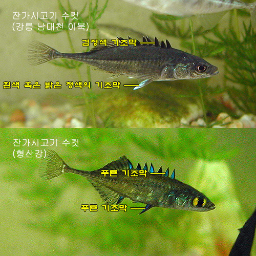 한편으로 체측의 얼룩 무늬의 경우도 잔가시고기보다 덜 뚜렷한 편입니다.