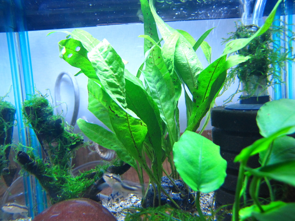 어항의 전경입니다. 유목과 작은 항아리..그리고 모스볼(청계에서 작은것은 3천원이더군요...ㅎ 시가 12000원을 생각하면 진짜 작은어항에 알맞은 사이즈네요 ㅎ 미크로소리움(반판만 구입했는데 양이 엄청나서 결국 분양좀 했답니다) 윌로모스 ( 활착시켜서 슬슬 올라오는것들 ), 나나로 구성되어 있답니다 ㅎ 모래는 가평산 금사입니다 ㅎ