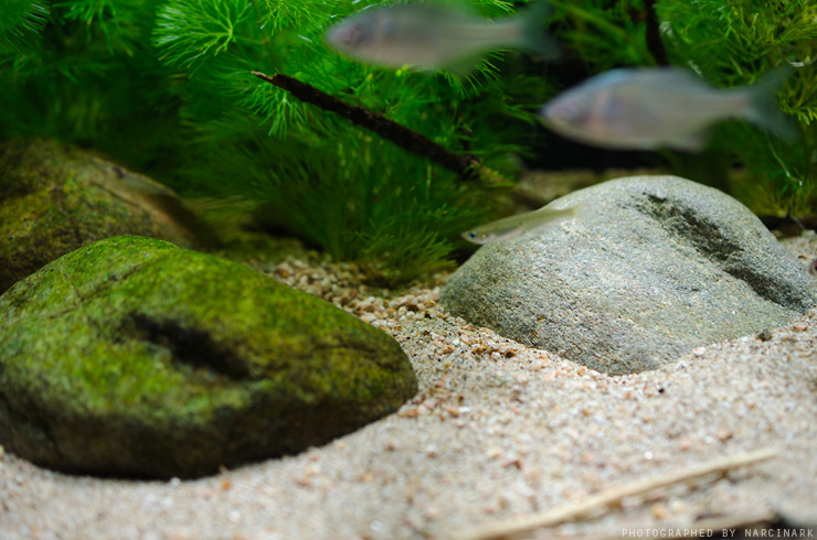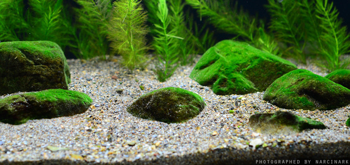 하지만 적당하게 낀 녹조류는 자연스러운 느낌을 주며 돌로 레이아웃한 어항에는 돌의 색을 통일시켜주는 고마운 존재이기도 합니다. 또한 물고기의 식사거리가 되기도 하구요~
