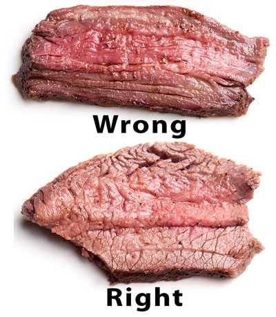 When cutting meat against the grain, the knife cuts across the muscle fibers, shortening them and making the meat easier to chew. Slicing with the grain leaves long muscle fibers, which can be tougher and chewier.