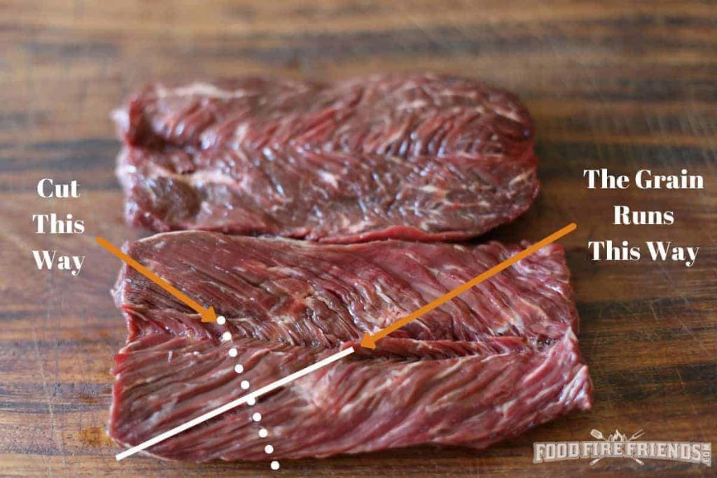 You can see the direction the grains run by looking closely at the thin white lines on the meat. In the photo of flank steak above the fibers run vertically from top to bottom.