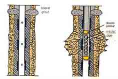 (4) 상하에 두 개의 패커가 장치된 주입관을 맨젯튜브 속에 넣고 원하는 위치부터 주입을 한다. 이때 주입재는 맨젯튜브의 주입공을 통해 고무슬리이브를 밀고 나와 Seal재를 파괴하며 지반 속으로 침투한다.