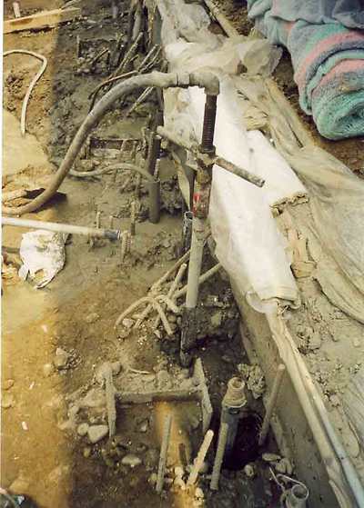 (3) 맨젯튜브의 삽입이 완료된 후, 맨젯튜브와 케이싱의 사이에 적당한 Seal재를 주입하고 케이싱을 인발한다. ---> '원효로빌딩'현장의 경우에는 만젯트 튜브를 집어넣어 Seal재를 따로 주입을 하지 않았다. Seal재 대신에 그라우팅 공사를 하며, 투입액을 적절한 시기에 규산소다를 투입시켜 Seal재 역할을 할 수 있도록 공사를 한다.(*이 사항은 (4)번 사항을 완료한 후 시공을 하게 된다)