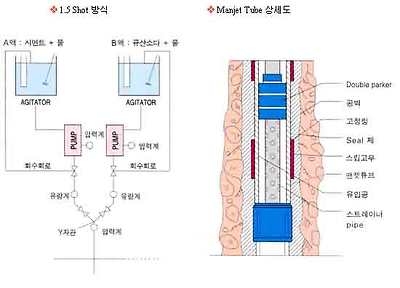 [참고사항] 위에서 Gel Time에 대해서 언급한 내용과 ‘시멘트액+LW제 혼합’에 대한 내용을 언급했지요. 이 부분은 직접 현장에서 시험을 해보시면 LW.Grouting의 원리를 쉽게 이해할 겁니다. 한가지 시험예로... 종이컵을 두 개를 준비해 놓고, 한쪽 종이컵에는 시멘트물을 한쪽 종이컵에는 규산소다(LW제)를 담아놓고, 두 개의 종이컵의 물을 서로 번갈아 왔다갔다하면서 섞어보시길 바랍니다. 그렇게 하다보면 약 30초도 않되어 시멘트가 굳어지는 것을 눈으로 보실 수 있을 겁니다. 그러면 위에 기술한 LW.Grouting에 대한 원리를 쉽게 찾을 수 있을 거라 생각이 드는군요.