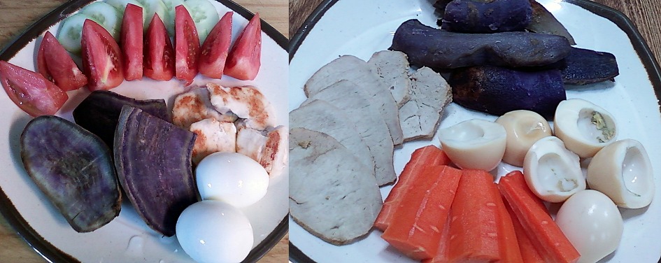 고구마, 닭가슴살 내지는 돼지 안심, 각종야채 과일, 계란흰자...