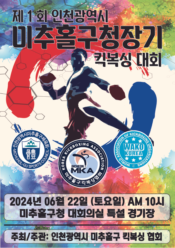 오는 6월 22일(토) 인천 미추홀구청 대회의실 특설링에서 제1회 인천시 미추홀구청장배 킥복싱 대회가 개최 됩니다. 구체육회 정가맹 기념 첫 대회가 성황리에 마무리 될 수 있도록 킥복싱 가족들의 많은 출전 그리고 참여 부탁 드립니다.