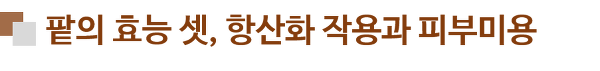 팥에는 그램당 2.5mg의 프로안토시아닌이 들어있다. 프로안토시아닌은 비타민 C의 50배, 비타민 E의 20배가 넘는 항산화 성분이다. 체내 유해산소를 없애고, 활성산소로 인한 세포파괴를 방지해 노화를 늦추는 효과가 있다. 팥은 피부미용에도 좋은 곡물이다. 팥에 함유된 비타민 B1과 B2는 세포재생을 돕고, 팥 껍질에 풍부한 사포닌은 미세한 거품을 일으켜 모공에 축적되어 있는 피지와 노폐물을 제거하는데 효과적이다. 실제로 조선시대에는 팥을 갈아 물을 섞어 얼굴에 문지르는 방법으로 천연비누 겸 각질 제거 기능을 했다고 전해진다.