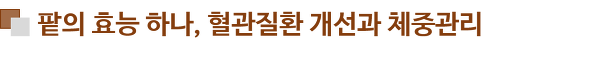 팥은 혈관질환 개선에서 좋은 음식이다. 팥에는 혈관 내에 쌓인 지방을 감소시키는 효과가 있는 사포닌과 혈중 콜레스테롤 수치를 낮춰주고 혈관을 튼튼하게 만드는 폴리페놀 성분이 풍부하게 함유되어 있다. 팥에 들어있는 사포닌은 피를 맑게 해주어 고혈압, 고지혈증, 동맥경화 등 각종 혈관질환을 개선하는데 도움을 준다. 팥은 콩류 중에서 폴리페놀 함량이 가장 높은 식품으로, 평소 혈압이 높거나 고지혈증이 있는 사람이 꾸준히 섭취하면 좋은 효과를 볼 수 있다.